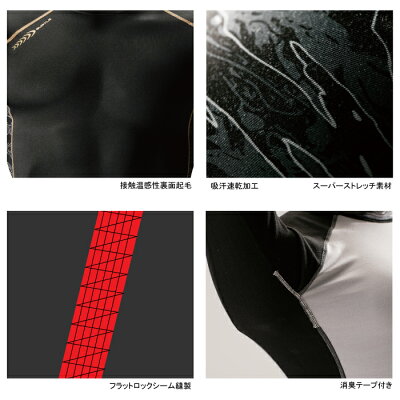 商品説明●秋冬用●素材:ポリエステル90%・ポリウレタン10%●フリーストレッチ裏面起毛●吸汗速乾加工●フラットロックシーム縫製●消臭テープ●サイズ:XS(バスト/82、裄丈/69、着丈/60)、S(バスト/84、裄丈/72、着丈/64)、M(バスト/90、裄丈/74、着丈/67)、L(バスト/96、裄丈/76、着丈/70)、XL(バスト/102、裄丈/78、着丈/73)●カラー:ホワイト、ブラック、ミドルグレー(杢)、インディゴ(杢)、カモフラブラック商品仕様快適に動作をサポートするスーパーストレッチ素材を使用。